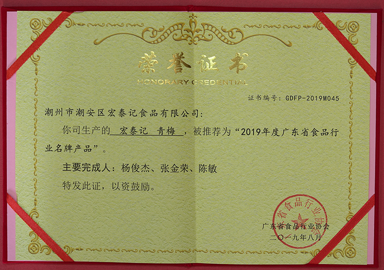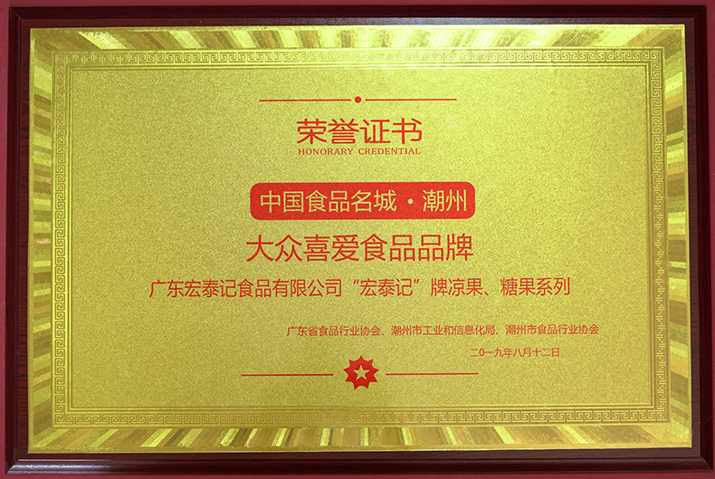 潮州市潮安区宏泰记食品有限公司以“中国食品名镇——庵埠”为依托,是一家集蜜饯、糖果研发、生产、销售于一体的民营企业公司以质量求生存,以品质求发展!通过严格执行国际质量标准管理,结合科学的研发、生产、营销模式,在此条件下公司生产的“加应子”、“酸甜杨梅”、“陈皮梅”等产品多次获得行业殊荣!公司始终坚持:以优秀的企业文化打造和提升企业核心竞争力,践行“优质原料、卓越工艺、质量为先、诚信为本;安全生产、预防为主、做放心食品回馈顾客”的诚信质量方针;履行“做放心食品、让祖国放心、让人民放心”豪迈的行业使命;宏扬“领先、卓越”的企业精神;唱响“快乐工作、幸福生活”的企业口号,引导企业的核心价值观!使公司在发展过程中牢固树立了企业在蜜饯行业良好的社会公众形象!